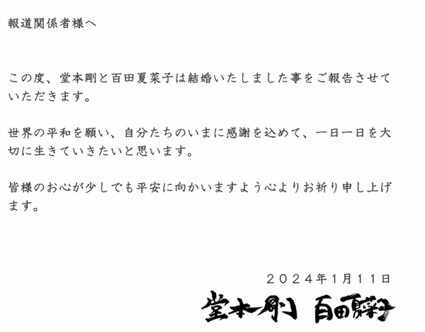 この度、堂本剛と百田夏菜子は結婚いたしました事をご報告させていただきます。